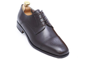 Zapato blucher de puntera recta con florón y trapada en canguro marrón. Acabado sobre una suela legitima cosida (cosido blake) y forro entero en piel.