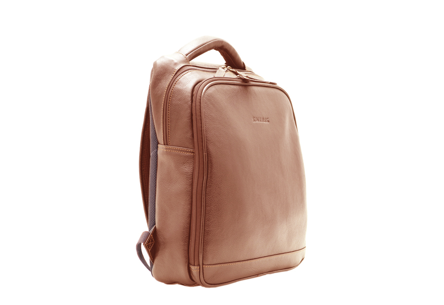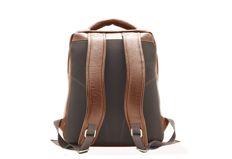 Mochila confeccionada en piel super resistente, forrada en loneta. Esta consta de dos aberturas principales una trasera y otra frontal. El frontal es un compartimiento de buen tamaño, un bolsillo interior con cremallera y varios accesorios para la colocación de materiales diversos. La trasera de mayor tamaño y profundidad consta de un bolsillo con solapa para tableta u ordenador personal. La parte espaldar esta forrada de un tejido técnico transpirable.